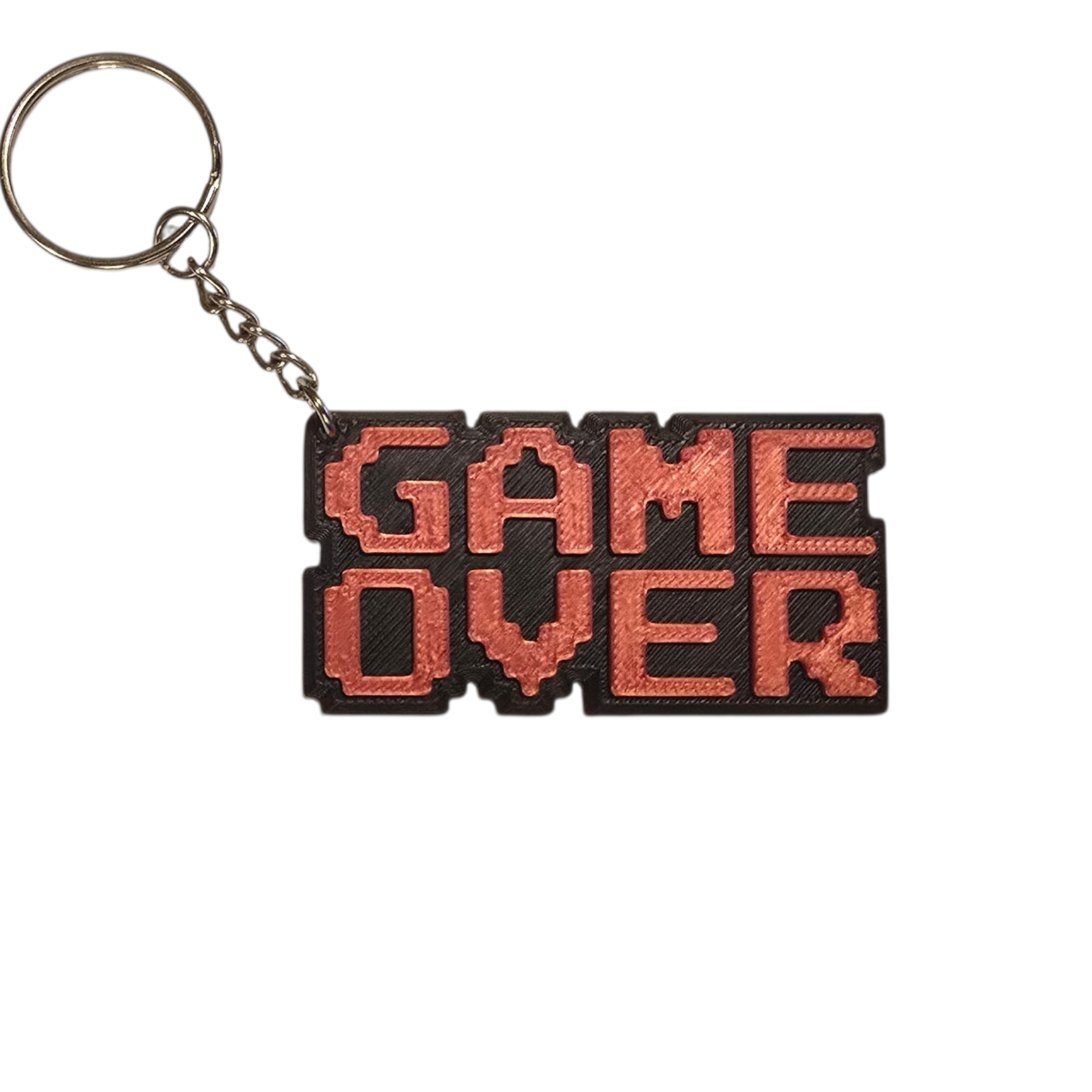 GAME OVER is a detailed 3D‑printed KEYCHAIN in RED and BLACK. This pixel‑text keychain brings classic arcade vibes to your keys. A great gift for gamers and collectors.